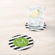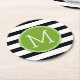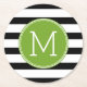 Black and White Striped Pattern Green Monogram Round Paper Coaster