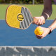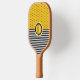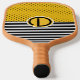 Here's a graphic design that features black and white stripes, on the bottom, with black polka dots on the top. The paddle has black and white stripes with a small area of polka dots. On the front you can add your initial. You can choose your grip colour, black, white or tan. For an additional cost you can purchase a protective cover and an outdoor Pickleball Ball.