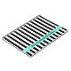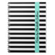 Personalized notebook featuring a pattern of black and white stripes. Across is an aqua blue band with customizable text. Add a name or other text. Elegant, contemporary design for women.