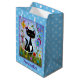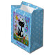 A black and white tuxedo cat with pretty green eyes, pink ears and wearing a red collar. She is sitting in a garden of green grass and pretty colourful flowers on a bright summers day. Around her are floating leaves and fluttering butterflies. This digital art piece is finished with a purple border. The background colour is blue and has a pattern of tiny white paw prints. Below the picture is a template in a dark blue text to add your name or message to personalize this pretty gift bag.