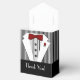 Elegant and formal-this little tuxedo gift box is personalized to suit your needs. Say thank you in a special way with a white lapel tux, maroon bow tie and rosebud boutonniere. Grey button down dress shirt. A black and white striped background with matching ribbon. Perfect for weddings or formal black tie dinners and fundraisers. To see other "tuxedo favour boxes" and matching products-Please visit my store "The Hungarican Princess" at www.zazzle.com/hungaricanprincess*. Look in my "Black Tie Tuxedo Collection" department category.