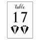 Black and white tuxedo two grooms gay wedding table number card. This elegant wedding design features a sophisticated black and white design, specifically tailored for a Mr & Mr gay wedding. The primary visual element thoughtfully showcases the upper portion of two gentlemen's formal suits, complete with distinguished bow ties, indicating the attire of the two grooms.