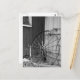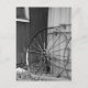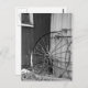 Personalize the rustic Black and White Wagon Wheel and Silo Postcard with your own message. This charming custom country postcard features a black and white farm photograph of an old wagon wheel leaning against a weathered dairy barn and cement silo in rural Midwestern Wisconsin.