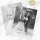 On the front, there is a placeholder black and white photo of the bride and groom kissing in a park. (It has a black and white filter, so if you replace it with a colour photo, your photo will become black and white). The text is written in black, in the lower part, with the words "thank you" in a modern script. On the back, there is the same photo, but transparent, decolorated to white, and a thank you message.