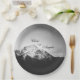 Black and white wedding under the mountains. Landscape photograph of a snow covered mountain with darkness below and white cloudy sky above. Names of the couple are in black font above the mountain in the sky and all the details are in white font below the mountain. Completely customizable and personalizable wedding products.