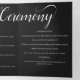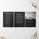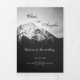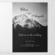 Black and white wedding under the mountains. Landscape photograph of a snow covered mountain with darkness below and white cloudy sky above. Names of the couple are in black font above the mountain in the sky and all the details are in white font below the mountain. Completely customizable and personalizable wedding products.