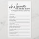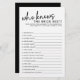 This chic "Who Knows the Bride Best" game is the perfect addition to your bridal shower festivities. With its clean, contemporary look and fun, interactive format, it's sure to have guests laughing, chatting, and celebrating the bride-to-be. Whether your shower has a black and white colour scheme or just a modern vibe, this game fits right in. Plus, it's a great way to get everyone involved and make sure the special lady of the hour feels showered with love (and a few surprises!).