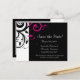 Bold and striking modern contemporary black wedding invitation set with white and magenta accents, with delicate swirl scroll leaf background. Customize online with your wedding details.