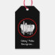 A custom restaurant, small business, chef, or gift tag with an elegant design of silverware on a white napkin embellished in greys and black inside a red circle on a black background. Upload your logo, change background colours and more, even save your design for later.
