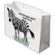 Add a wild touch to gifts with this personalized gift bag. It features a realistic style illustration of a zebra in black and white standing in some green grass with your own custom message in bold black lettering.