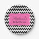 Personalized black and white zigzag chevron pattern and hot pink background. Bridal Shower paper plates. In the middle there is a hot pink shape where you can add your text.