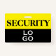 This custom identification badge features a black and yellow design with the title "SECURITY" printed in a large black font over a yellow background. A sample company or business logo is placed in the centre which you can replace with your own custom logo or other image. The back of the security guard ID badge contains contact details and additional information.