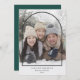 This modern holiday photo card features a large photo and a simple black arch overlay. The arch is centred on a full photo that is oriented vertically. Personalize with your favourite family photo, a custom Christmas greeting, and your names and year at the bottom. On the back of the card, you'll find room for more photos and/or a custom message if desired. The dark forest green background colour on the back can be changed.