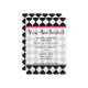 An invitation featuring a black and white argyle background with hot pink trim. Opposite side features matching pink circle shaped frame with text "You Are Invited." Personalize the text with details of your occasion.