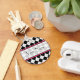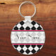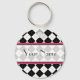 A keychain featuring a black argyle background with hot pink trim. Personalize with your name over sheer centre section.