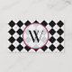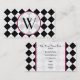 A business card featuring a black argyle background with pink trim. Black text over sheer white. Personalize with your information. Opposite side features matching argyle background. Add your initial inside pink circle shaped frame. To adjust text or to change font size, style, or colour, just click "customize it!"