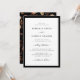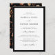 This elegant wedding invitation has a beautiful script on the front and a whimsical fall pattern on the back with hand-painted watercolor burnt orange and terracotta leaves, cream and beige dahlias, and beautiful rust-coloured roses on a black background. Find matching items in the Black Autumn Romance Collection.