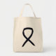 Tote bag features black awareness ribbon art. The black awareness ribbon colour means support for Anti-Gangs, Anti-Terrorism, Melanoma, Mourning, Narcolepsy, Sleep Disorders, Trauma Awareness, and Gun Control. Let this black awareness ribbon help bring awareness to these causes!