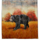 A cute black Bear taking a stroll through a field of bright fall coloured foliage.