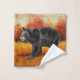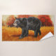 A cute black Bear taking a stroll through a field of bright fall coloured foliage.