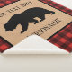 In the centre is a silhouette of a black bear with text templates above and below in black lettering so you can personalize. this image and text is inside a burlap square with a black border. The background pattern is a lumberjack red and black buffalo plaid.