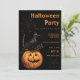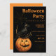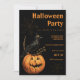 Modern Halloween party invitation featuring spiderwebs at the corners of the design with "Halloween Party" displayed in orange letter typography with a funny blackbird and Jack Lantern on a black and white background. Personalize the black and orange Halloween party invite with your party details.