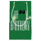 White Happy Birthday text on green background with confetti, candle, black balloons, and sparklers.