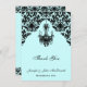 This stylish pale blue and black damask chandelier thank you card on invitation paper matches the wedding invitation shown below. The text and paper type is all customizable. If you require any other matching items, please email your request to niteowlstudio@gmail.com.