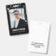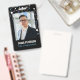 Vertical employee ID personalized with photo, name, and department or title with a black background and molecule graphics in white and blue. An employee ID badge for a science role. Science themed employee ID badge printed with photo.