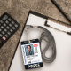 Vertical press ID with black and blue as accent colours. Add photo, logo, name, title, ID number and more.