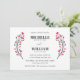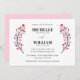 A simple modern wedding invitation featuring sweetly painted flower branches in watercolor black and blush pink adorning your names on either side, with the details displayed below in formal fonts over a clean white background.