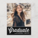 Invite family and friends with this customizable class of 2023 graduation invitation postcard. It features a white retro script typography on a black background. Personalize this black graduation party postcard by adding your photo, name and school name. This photo graduation invitation postcard is perfect for high school or college graduations.