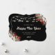 Elegant black New Year card featuring a watercolor painting of poinsettia, holly and red berries along with string lights. Easily personalize online.