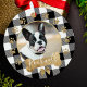 Add a cozy and warm charm to your Christmas tree with our Pet photo metal ornament featuring a cozy and warm black and white buffalo plaid pattern background. Circle photo frame with a festive faux gold bow and bone. Customize with your pets name & photo. Designed by Moodthology Papery