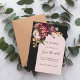 A modern, stylish and romantic Save the Date card for a wedding. Black coloured background, a soft pink coloured arch frame, it’s beautifully adorned with flowers in pink, burgundy, cream. Personalize and add the date, your names.