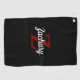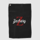 This personalized golf towel features a burgundy red monogram initial and white retro script name on a black background. The perfect Father's Day or birthday gift for the golfer dad, grandpa, or husband on your list.