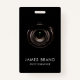 A modern ID badge for photographers showing your name and job title as well as a camera lens on black background. Ideal for photographers who would like to identify as such while working events.