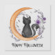 This design features a black cat sitting on a crescent moon surrounded by purple flowers and the phrase "Happy Halloween". It is perfect for a Halloween celebration.