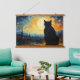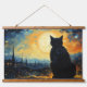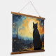 Whimsical funny animals, night city and starry sky. Cute little black cat is looking to the starry sky inspired by Vincent van Gogh. Colourful fantasy landscape. Digital oil painting, fine art.