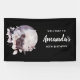 Birthday banner with a watercolor painting of a black cat and a light purple and pink floral bouquet. Standing in front a a large full moon. Stylish and magical.