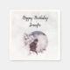 Paper napkins with a watercolor painting of a black cat and a light purple and pink floral bouquet. Standing in front a a large full moon. Stylish and magical.