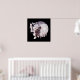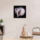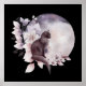 A poster with a watercolor painting of a black cat and a light purple and pink floral bouquet. Standing in front a a large full moon. Stylish and magical.