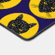 A retro-looking illustration of the face of a yellow-eyed black cat appears in a moon-like circle in this original Halloween-appropriate art by Richard H. Fay.