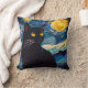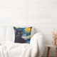 Throw pillow with illustration of a beautiful black cat against blue and yellow background.