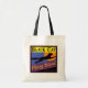 A tote bag with new vintage Halloween art reading Black Cat Flying School with a black cat flying against a full moon with vintage letters.