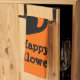 A silhouette cartoon of a black cat with a green star. The towel is orange with a "Happy Halloween" message.