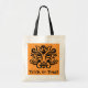 Trick or treat bag with stylized black cat face on orange background.