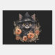 Wrapping paper sheets with a cute illustration. A black long-haired cat wearing a black witch's hat. It's ears poking out. Surrounded by orange and brown autumn flowers. Awesome design for witch themed items and Halloween.