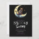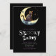 At the top of the invitation, an adorable scene features a super cute black cat skitting playfully across a crescent moon. Surrounded by twinkling stars, this mischievous feline adds a whimsical, magical touch to the design, blending spooky charm with a dash of cuteness. It's the perfect detail for a Halloween party that embraces both fun and mystery.
