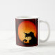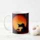 Scary black cat with orange eyes in front of a big, full, orange moon.